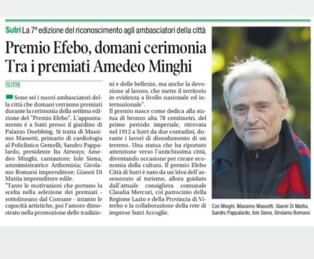 On July 14, 2025, Amedeo Minghi was aworded the "PREMIO EFEBO". See details on the following link: www.latuaetruria.it/i-video/51-video/8373-premio-efebo-2025-citta-di-sutri-la-cerimonia-di-premiazione