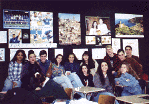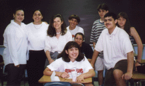 On April 26th,2000, the students of Italian at NEW ROCHELLE HIGH SCHOOL finally had the pleasure of meeting Amedeo Minghi in person. Approximately 170 students assembled in the school's library where Amedeo joined them. The students asked him numerous questions about his songs and his career, and Amedeo took the time to answer every one of them. He was visibly moved by the students' interest in his music, and by the many welcoming signs they made and placed throughout the school. The excitement heightened when the students joined Amedeo in singing their favorite song, LA VITA MIA, while he played the piano. At the end of his visit, the students presented Amedeo with a bouquet of roses and a plaque with a message of appreciation for his visit and his beautiful songs.